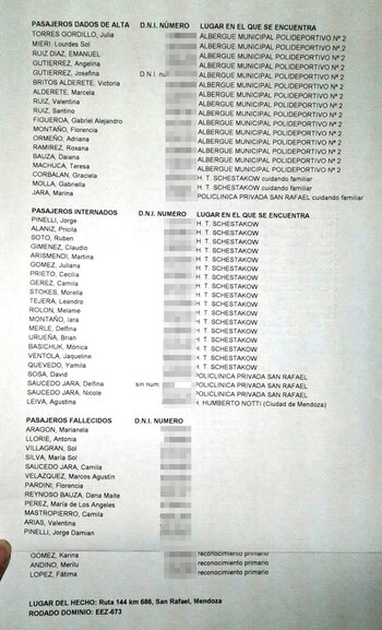 La lista fue confeccionada por el Ministerio Público Fiscal de Mendoza y también se informa las identidades de las personas que recibieron el alta y que, en su mayoría, fueron derivadas al albergue municipal de San Rafael, Mendoza.