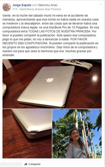 "Gente, en la noche del sábado murió mi nena en el accidente de Mendoza, aprovechando que esa noche no había nadie en nuestra casa se metieron y la desvalijaron, entre las cosas que se llevaron había una computadora marca Apple, es una MacBook Pro de 13 Pulgadas. En esa computadora tenía TODAS LAS FOTOS DE NUESTRA PRINCESA", publicó Zapata en un portal especializado en compra y venta de autos y motos de segunda mano.