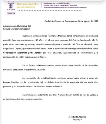"Cuando el Instituto de los Hermanos Maristas tomó conocimiento de un hecho ocurrido hace aproximadamente 38 años, en el que un ex alumno del Colegio Marista de Morón padeció un manoseo agraviante, inmediatamente dispuso al traslado del Director General Hno. Ángel Darío Duples, quien reconoció el hecho", rezó el comunicado, firmado por el hermano Alberto Aparicio.