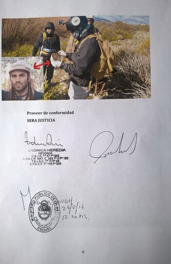 En las pruebas presentadas ante la Justicia, se cuenta el video que mostraría a Maldonado en el corte del 1 de agosto pasado, con imágenes que dan detalles de la vestimenta que usó aquel día y la gorra que fue hallada por la Policía de Seguridad Aeroportuaria (PSA) dentro de la comunidad, durante un allanamiento realizado el 5 de agosto. "Entre las fotos que nos fueron acercadas a través de las redes sociales se observa a Santiago con la misma vestimenta con que se lo ve en el video publicitado", dijo la familia.