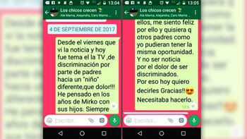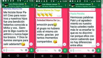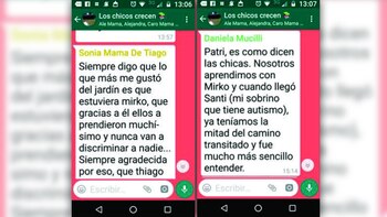 Y las respuestas, claro, no tardaron en llegar desde los teléfonos de las mamás emocionadas, que para sorpresa de Patricia terminaron agradeciéndole a ella y a su hijo: "-Siempre digo que lo que más me gustó del jardín es que estuviera Mirko, que gracias a él, ellos aprendieron muchísimo y nunca van a discriminar a nadie", dijo Sonia.