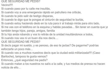 Pos había compartido un duro mensaje en su muro de Facebook a fines del año pasado, una larga misiva contra quienes critican a la Bonaerense y a sus efectivos. "¿Qué seguridad me pedís? ¡Vecino!.. Si tu hijo anda robando y vos lo retirás de la unidad insultándonos a todos", decía.