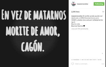 Además, escribió: "Si sentís que esto puede ser dedicado a vos,¡ claramente es para vos! y todos los que actúan nefastamente igual". Horas más tarde Nazarena borró su posteo.