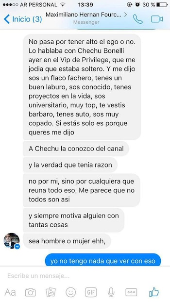 Al momento de la conquista amorosa, no vale todo. El respeto, por caso, no puede quedar al margen. Y Maximiliano Fourcade habría caído en el papel de "acosador", según señalan en las redes sociales, debido al modo en el cual pretendió -mediante chats de dudoso gusto- ganarse la simpatía de algunas mujeres.