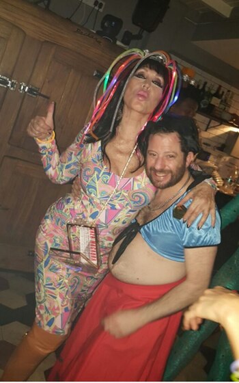 La diva se disfrazó de ella misma, con un colorido vestido y tiras de luces led de colores que simulaban ser su pelo. El ex de Vicky Xipolitakis, por su parte, se fotografió con Moria con una pollera roja y un top celeste.