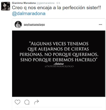 Sobre este tema, la ex del Kun Aguero y mamá de Benjamín escribió desde su cuenta de Twitter: "¡Creo que nos encaja a la perfección sister! @dalmaradona". Y compartió una imagen con la siguiente leyenda: "Algunas veces tenemos que alejarnos de ciertas personas, no porque no queremos hacerlo, sino porque debemos hacerlo".