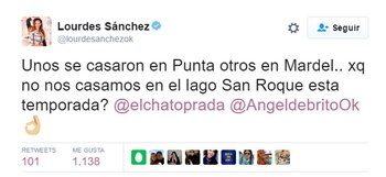 Inspirada por estas parejas, Lourdes Sánchez decidió hacerle una propuesta al Chato Prada a través de su cuenta de Twitter. "Unos se casaron en Punta otros en Mardel… ¿por qué no nos casamos en el lago San Roque esta temporada? @elchatoprada", escribió en la red social.