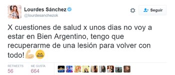"Por cuestiones de salud por unos días no voy a estar en Bien Argentino, tengo que recuperarme de una lesión para volver con todo!💪🏼😁", escribió la mamá de Valentín en su cuenta oficial de Twitter.