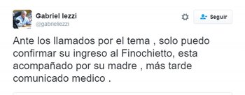 Por su parte, la periodista Laura Ubfal aseguró a través de su cuenta de Twitter que la internación del cantante se debió a un cuadro de deshidratación y sobre excitación motriz.