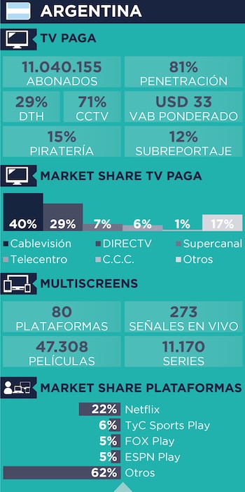 En lo que tiene que ver con el multiscreens o pantallas múltiples, Argentina cuenta con 80 plataformas, 273 señales en vivo, 47.308 películas y 11.170 series. Y por último, cerrando los datos que ofrece la consultora BB, está lo que denomina "marcket share plataformas", basada en un ranking según los modelos de negocio SVOD, TV Everywhere y TVOD: Netflix lidera con el 22%, TyC Sports Play le sigue con el 6%, y luego le sigue Fox Play y ESPN Play, ambos con el 5%.