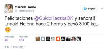 Marcela Tauro, compañera de Kaczka en la radio, fue la primera en anunciar la noticia por Twitter. "Felicitaciones @GuidoKaczkaOK y señora!! …nació Helena hace 2 horas y pesó 3,100 kg", escribió en la red social.