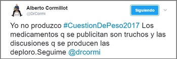 En su cuenta de Twitter Cormillot dejó muy en claro lo que piensa sobre el programa. "No estoy distraído (al aire). Me aburre el programa. Su contenido y las publicidades no tiene que ver con la idea original", escribió el doctor, especialista en nutrición. Pero fue todavía más duro: "Estoy viendo cómo terminar pronto. Es una vergüenza por la que pido disculpas al público y a los que padecen sobrepeso. También a mis colegas, autoridades de salud, sociedades y organizaciones científicas relacionadas con el tema".