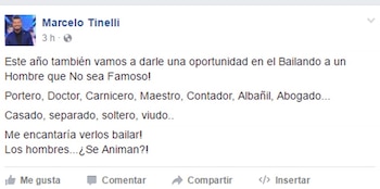 "Le vamos a dar la oportunidad a un hombre que no sea famoso. Portero, doctor, carnicero, maestro, contador, albañíl, abogado… Casado, separado, soltero, viudo. Me encantaría verlos bailar. ¿Se animan?", escribió el conductor en su cuenta de Facebook.