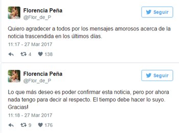 Esta mañana, la actriz de Quiero vivir a tu lado hizo referencia al rumor a través de su cuenta de Twitter: "Quiero agradecer a todos por los mensajes amorosos acerca de la noticia trascendida en los últimos días. Lo que más deseo es poder confirmar esta noticia, pero por ahora nada tengo para decir al respecto. El tiempo debe hacer lo suyo. Gracias!".