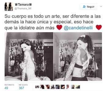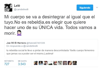 Por esta publicación, recibió críticas y halagos por parte de sus seguidores. Uno le escribió: "Tu rebeldía social te llevo a pintar de manera descontrolada un bello cuerpo femenino que jamás va a poder ser el mismo. ¡Lastima!". La joven no se quedó callada y le respondió: "Mi cuerpo se va a desintegrar al igual que el tuyo. No es rebeldía, es elegir que quiere hacer uno de su ÚNICA vida. Todos vamos a morir".