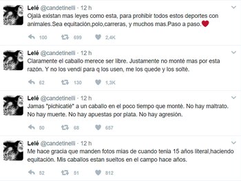 Candelaria Tinelli (26), ferviente defensora de los animales, celebró la decisión de su padre y le agradeció desde su cuenta de Twitter. Pero, una de sus seguidoras recordó que ella solía practicar equitación y le hizo un "planteo moral" en tono irónico: "¿Sabías que los caballos sufren cuando hacen equitación, jugando al Polo, corriendo carreras? ¡¡¡¡Ah claro!!!! Eso es muy élite. No al maltrato".