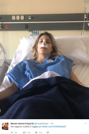 Fiel a su estilo, se tomó la situación con su humor característico. "Me ca…a piñas cinco ninjas", fue uno de los tweets que subió, en donde se la ve en la camilla con la nariz cubierta de vendas y apósitos.