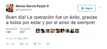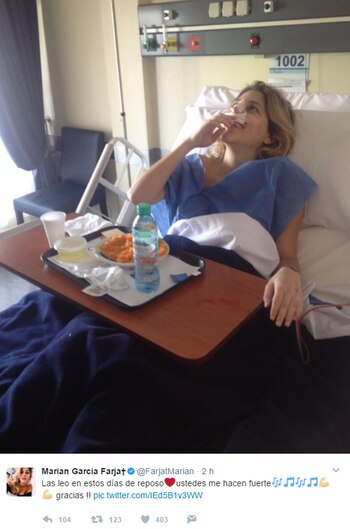 Claro que ni siquiera en este estado Marian descuidó a sus miles de fans, a las que también les agradeció el apoyo. "Las leo en estos días de reposo, ustedes me hacen fuerte, gracias !!", fue otro de los mensajes acompañado por emojis de notas musicales y brazos musculosos.