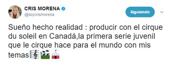 "Sueño hecho realidad: producir con el Cirque Du Soleil en Canadá la primera serie juvenil que le cirque hace para el mundo con mis temas", escribió Cris en su cuenta de Twitter, acompañando el mensaje con simpáticos emojis de letras musicales, la claqueta cinematográfica y la carpa de un circo.