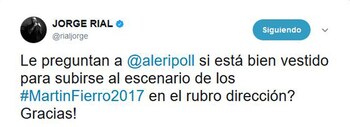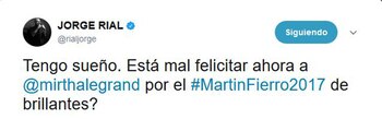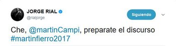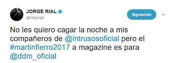 "No les quiero cagar la noche a mis compañeros de Intrusos, pero el Martín Fierro 2017 al mejor magazine es para El Diario de Mariana", "che, Martín Campi, preparate para el discurso", "me dicen que gana Paulo Vilouta en su rubro, ¿será?", fueron algunos de los mensajes del periodista en la red social, previo a la entrega de las estatuillas.
