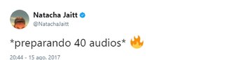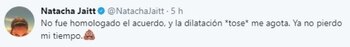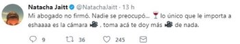 Antes de publicar en Twitter los nuevos audios y chats -que después eliminó de la red social-, Natacha hizo un descargo. "Preparando 40 audios. Mi abogado no firmó. Nadie se preocupó. Lo único que le importa a ella es la cámara. Tomá, acá te doy más. De nada", escribió la mediática, y agregó: "No fue homologado el acuerdo y la dilatación me agota. Ya no pierdo mi tiempo".