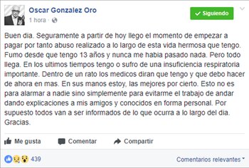 "Hoy llegó el momento de empezar a pagar por tanto abuso realizado a lo largo de esta vida hermosa que tengo". Así comienza el texto que Oscar González Oro (65) publicó este sábado en su cuenta de Facebook, donde hace un anuncio muy relevante: tiene una "insuficiencia respiratoria importante". Y en las próximas horas los médicos determinarán qué la ocasiona. "En sus manos estoy", dijo.