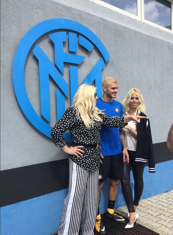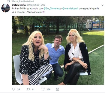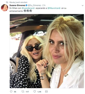 "En Milan con Wanda esperando a Mauro Iardi en su entrenamiento", escribió la diva en su cuenta de Twitter, junto con una foto de ella y la modelo. Con la misma imagen, la mayor de las Nara escribió: "Con la número uno en casa".