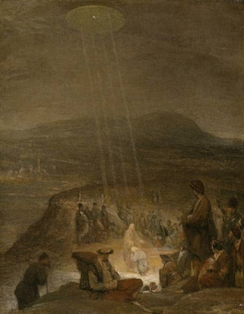 En Mateo 3:16, del Nuevo Testamento, se asegura que "los cielos se abrieron, y al Espíritu como una paloma descendió sobre él". Esto aseguran los especialistas en arte que representa la obra del holandés Aert De Gelder. Para los teóricos de los antiguos astronautas, en cambio, es otra prueba de un platillo volador no identificado.