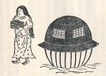 La ilustración retrata las características del objeto que hallaron los marineros flotando en el océano. Del "bote hueco", como se lo llama, bajó una mujer, que al no hablar japonés, regresó a su nave y se perdió en el mar. Para los folclorista japoneses es solo una historia, para los ufólogos, una evidencia irrefutable.