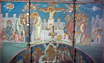 Existen infinidad de representaciones de la crucifixión y-en muchas de ellas- se aprecia tanto al sol, como a la luna. En este caso, el fresco que se encuentra en el monasterio de Visoki Decani de Kosovo tiene, a ambos lados del Cristo, dos figuras humanas volando unos objetos, al menos particulares. Para los expertos, no es más que otra forma de mostrar el ciclo de la vida, el día y la noche, de una manera humanizada.