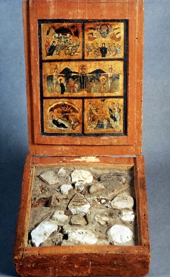 En la Biblioteca del Vaticano, Roma, se encuentra una caja relicario, que contiene piedras de Palestina, del siglo 6 ó 7. La imagen de la caja, una de las varias que posee, representa a María en la tumba de Jesús. Detrás, se eleva un extraño objeto, con una cúpula con diferentes entradas -o luces- desde donde sale un haz de luz.