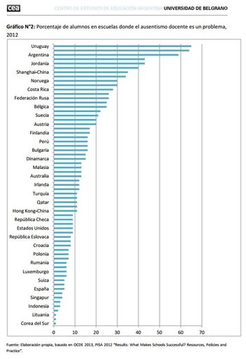 En esta oportunidad, un estudio del Centro de Estudios de la Educación Argentina (CEA) de la Universidad de Belgrano en base a los resultados de las últimas pruebas PISA, indicó el alto y preocupante nivel de ausentismo escolar que se vive en todo el país. Respecto a los docentes, si se lo compara a nivel regional, es 1,7 veces mayor que el de Brasil y 2,3 veces mayor que el de Chile. A nivel mundial, 3,5 veces mayor que el de México; 3,7 veces mayor que el de Perú, y 59 veces mayor que el de Corea del Sur.