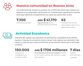 Según un informe reciente de la empresa, más allá del ingreso que perciben los anfitriones de Airbnb, la plataforma ayuda a impulsar la economía local al atraer más viajeros, por períodos más largos y a barrios que tradicionalmente se benefician menos de la actividad turística: en la Ciudad de Buenos Aires, hubo 150.000 llegadas de huéspedes en el 2016. La actividad económica consecuente fue de 1706 millones de pesos, una suma que incluye el ingreso de los anfitriones, los gastos del huésped y una estadía promedio de 7 días.
