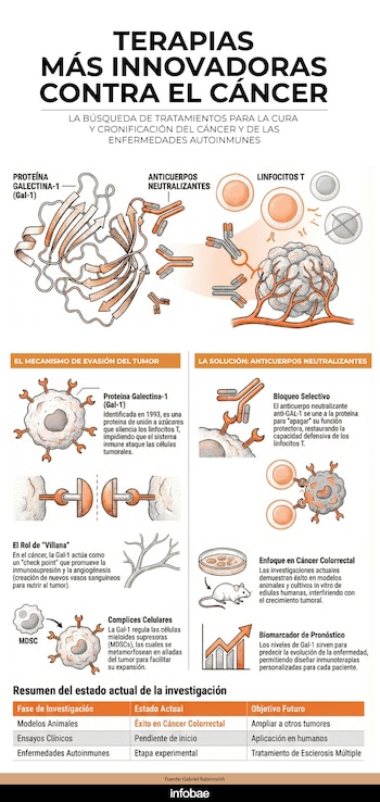 El mecanismo que Rabinovich estudia y experimenta en animales de laboratorio está impulsado por la proteína Galectina-1 (Gal-1), que interactúa con azúcares -llamados glicanos- y regula la actividad de las células mieloides supresoras (MDSCs). Estas células, producidas en la médula ósea, pueden bloquear la respuesta inmune y facilitar la expansión del cáncer.