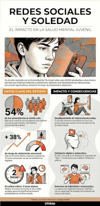 Más de la mitad de los estudiantes universitarios en Estados Unidos experimenta sentimientos de soledad, y quienes destinan al menos dos horas diarias al uso de redes sociales presentan una probabilidad significativamente mayor de sentirse aislados.