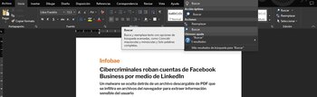 La otra opción consiste en seleccionar una palabra en especial dentro del área de trabajo que ya se tiene disponible y hacer clic en el botón Buscar, que se encuentra en la parte superior derecha de la barra de herramientas de Inicio. En ambos casos es posible borrar la palabra que se busca en el panel y reemplazarla por otra.