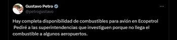 A través de su cuenta de X, el presidente Gustavo Petro se ha referido a la situación de los combustibles de las aeronaves. Según el jefe de Estado, “hay completa disponibilidad de combustibles para avión en Ecopetrol. Pediré a las superintendencias que investiguen porque no llega el combustible a algunos aeropuertos”.
