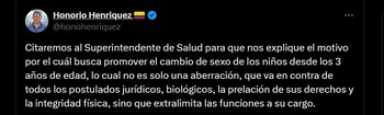 “Citaremos al superintendente de Salud para que nos explique el motivo por el cual busca promover el cambio de sexo de los niños desde los 3 años de edad, lo cual no es solo una aberración, que va en contra de todos los postulados jurídicos, biológicos, la prelación de sus derechos y la integridad física, sino que extralimita las funciones a su cargo”, indicó Honorario Henríquez.