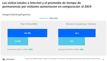 Las visitas a los sitios de los bancos casi se duplicaron entre abril de 2019 y abril de este año, con la particularidad de que no hubo distinción de edades; el crecimiento fue el mismo entre los menores de 35 que entre los mayores. Estos últimos, ya sea porque operan más o porque la falta de costumbre de hacerlo los demora, permanecen más tiempo conectados. En minutos promedio por visitante, crecieron un 47% contra el 21% entre quienes no superan los 34 años.