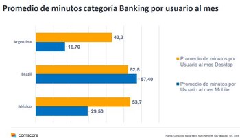 Otro rasgo de las audiencias argentinas para la categoría financiera -que se repite, según Dufour, en otras como la venta retail o los sitios de noticias- es que la penetración a través de los celulares es muy alta pero el tiempo de navegación es más largo en la conexión por computadoras de escritorio. El dato da a entender que para hacer operaciones más complejas los argentinos eligen la PC por sobre el celular.