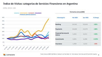 “El efecto del COVID-19 como fenómeno sanitario global y las medidas restrictivas que le siguieron causan múltiples efectos que todavía no están medidos. En lo financiero, en la Argentina hay algunas tendencias muy claras entre los usuarios, como un aumento en el uso de las herramientas digitales”, explicó un informe sobre banca digital de Comscore, empresa especializada en medición de audiencias digitales, con datos de abril y mayo.