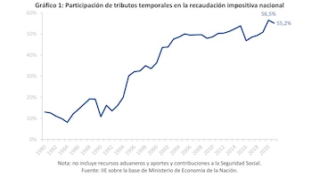 Hace 40 años, los impuestos temporales explicaban el 10% de la recaudación nacional, y con el paso de los años su participación se multiplicó por cinco: hoy más de la mitad de la recaudación nacional se explican por impuestos que surgieron como temporales. El listado es el siguiente:
