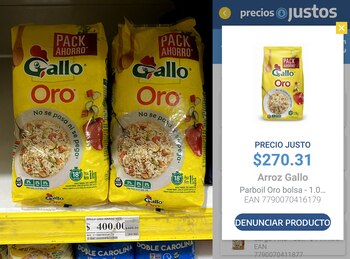 - Arroz Gallo Oro 1 kilo: $270 en Precios Justos y $400 en autoservicios (48%);