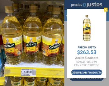 - Aceite Cocinero 900 ml: $263 en Precios Justos y $500 en autoservicios (90% de diferencia);