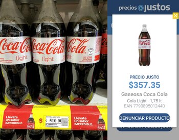- Gaseosa Coca Cola Light de 1,75 litros: $375 en Precios Justos y $510 en autoservicios (diferencia de 36%);