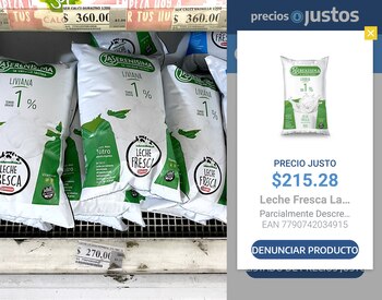 - Leche en sachet La Serenísima 1 litro: $215 en Precios Justos y $270 en autoservicios (diferencia de 25,5%);