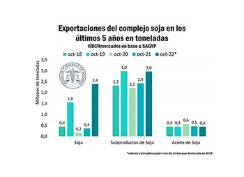 Por otro lado, los economistas analizaron las operaciones al mercado internacional, donde ya constan Declaraciones Juradas de Venta al Exterior por un total de 5,8 toneladas que tienen como mes de embarque octubre de 2022, de las cuales 5,2 millones de toneladas, es decir un 90% de las registradas para exportar, se anotaron durante la vigencia del dólar soja. Además, se precisó que el volumen declarado para el décimo mes del año resulta 80% superior a las exportaciones del complejo soja del año previo y 56% mayor al promedio de los últimos 3 años.