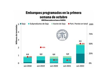 Según se detalló en un informe elaborado por economistas de la Bolsa de Comercio de Rosario (BCR), se duplicaron los embarques del complejo sojero programados para el presente mes. Al respecto, el informe privado aporta datos de la NABSA, los cuales detallan que el complejo soja embarcará al menos unas 2,45 millones de toneladas solamente en las próximas dos semanas del mes que recién se inicia, es un 175% en relación al promedio de los últimos 4 años.