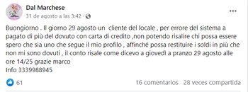 Rainieri, en su perfil de Facebook, escribe: “El 29 de agosto un cliente del restaurante, debido a un error del sistema, pagó más de lo que debía con tarjeta de crédito, sin poder rastrear quién podría ser, espero que sea alguien que sigue mi perfil, para que pueda devolver el dinero extra que no me deben. Como decía, la factura se remonta al almuerzo del jueves 29 de agosto a las 14:25 horas”.