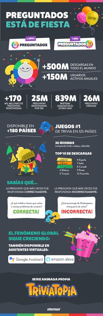 Esta semana, la gente de Etermax reveló las impresionantes estadísticas del juego de trivia que causó furor en la región y ya trascendió las barreras de las aplicaciones móviles para llegar a diferentes plataformas y hasta los juegos de mesa. “Con más de 500 millones de descargas a nivel global y más de 150 millones de usuarios activos anuales, el fenómeno global de Preguntados está disponible en más de 180 países alcanzando el puesto N°1 en juegos de trivia en 125 países. Estados Unidos (donde es conocido como Trivia Crack), Brasil y Argentina encabezan el top 10 de países con más descargas de Preguntados y Preguntados 2”, anunció el comunicado oficial.